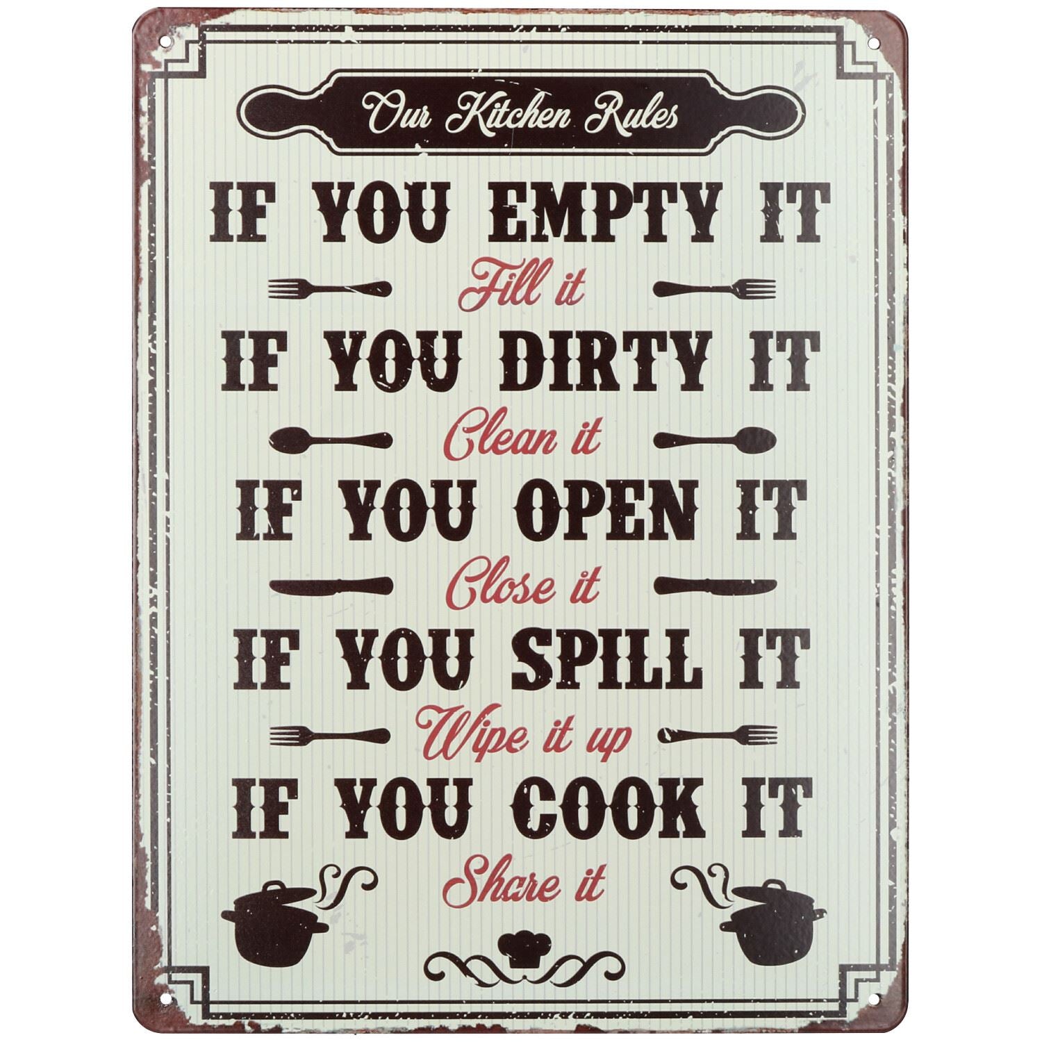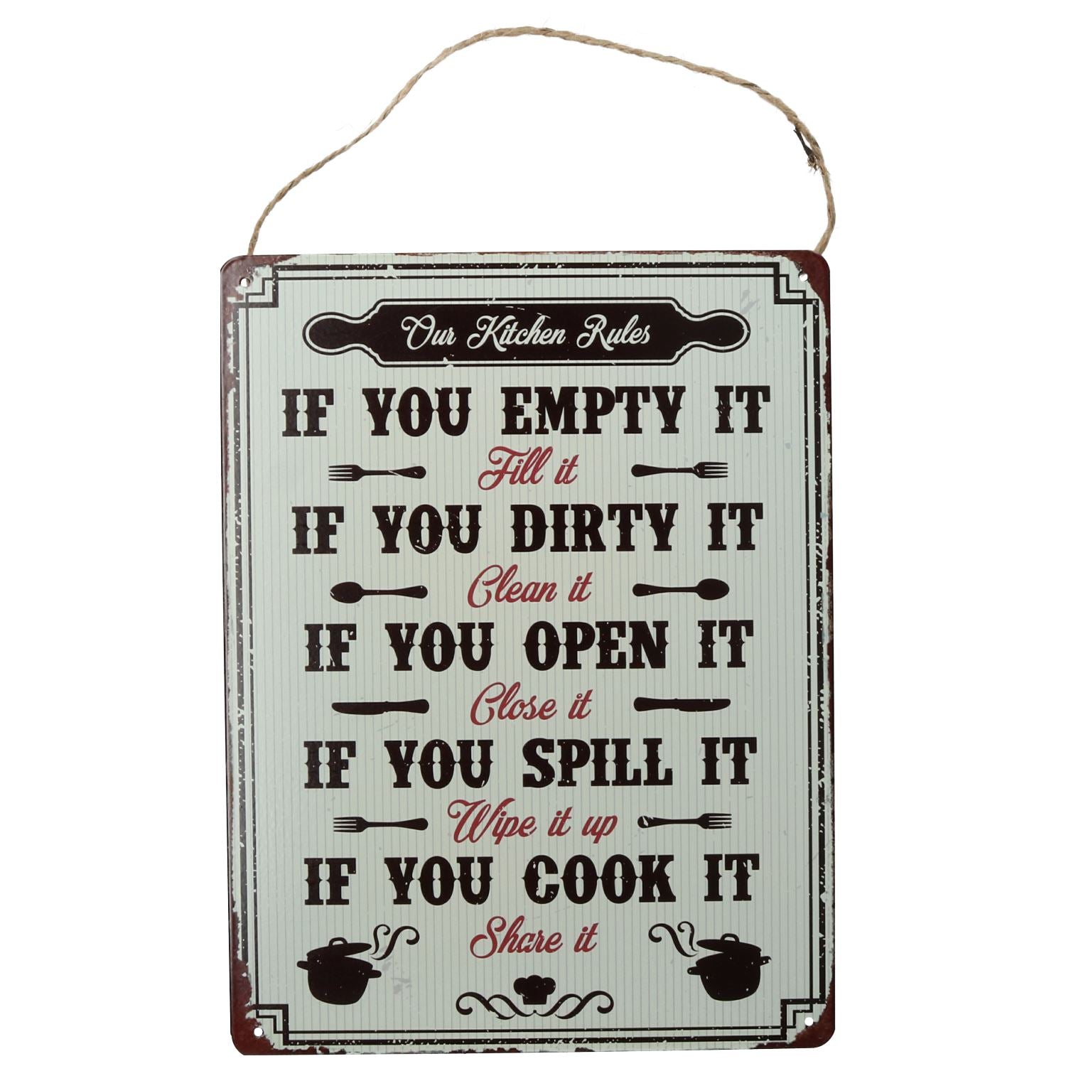 Hanging Retro 'Our Kichen Rules''Metal Sign Home PrePunched Hole 25x33cm
